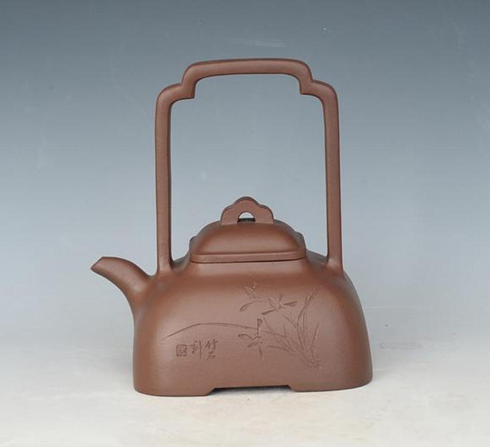 此壶端庄大方、色泽温润、制技精巧、线面和谐。壶身呈收口方形,四角圆转,平缓自然;提梁挺拔有力,转角过渡圆润饱满。桥梁钮与壶身身形相呼应,有足底。整器造型布局合理,营造出虚与实、圆与方的对比,使此壶更具古色古香之沉韵,乃代表作之一。